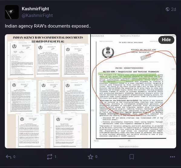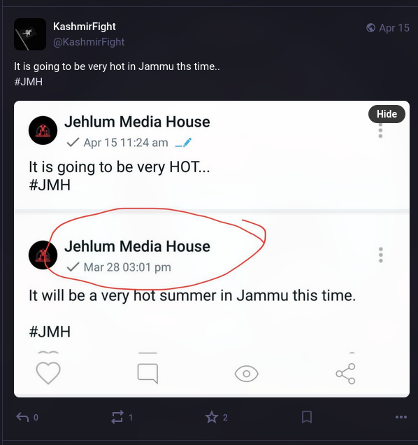 https://mastodon.social/@KashmirFight This seems to be the official account the TRF (the resistance front) uses.