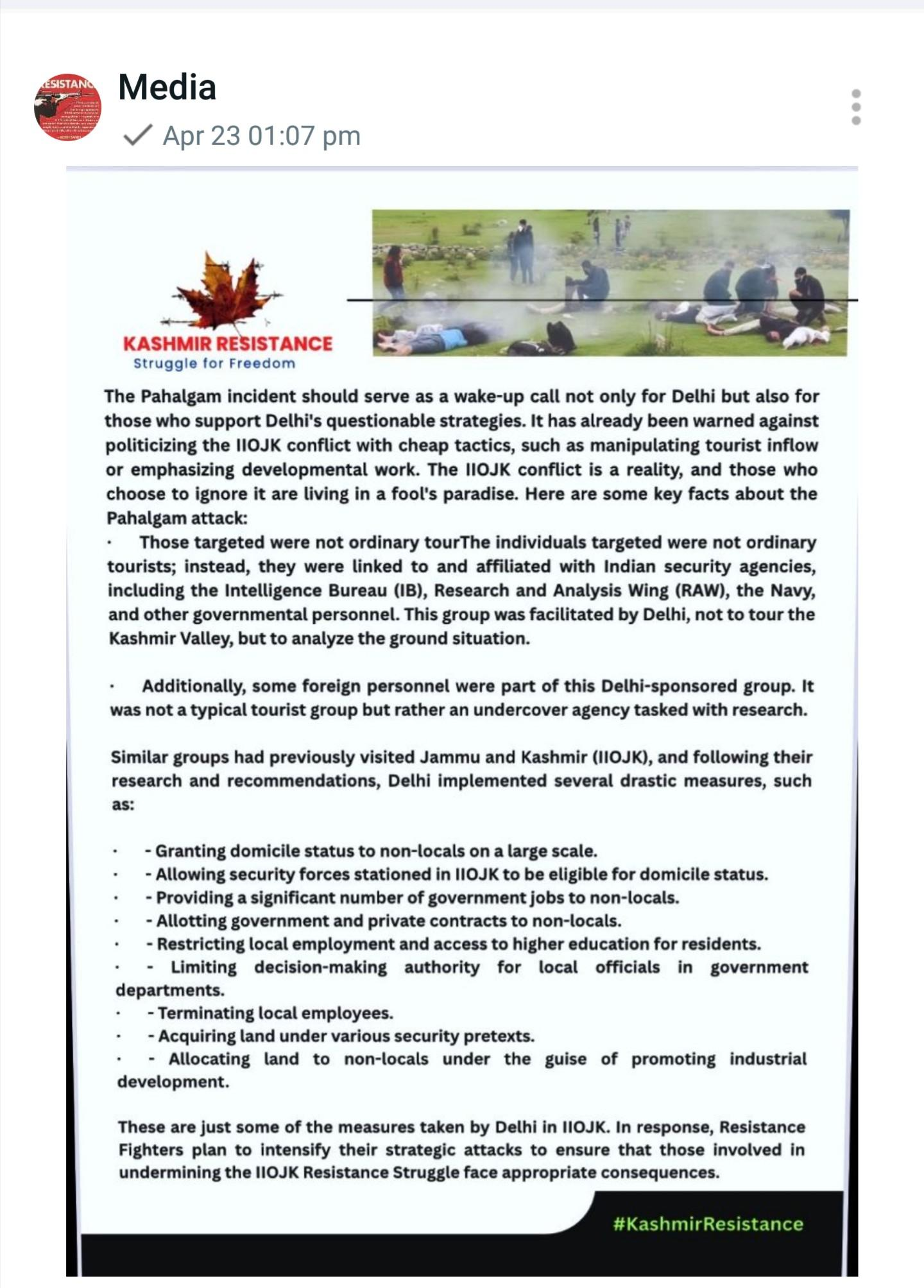 The Resistance Force (trf), kashmir resistance, kashmirforce admitted that the attack was done by them.